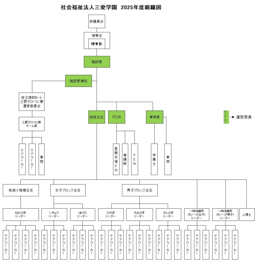 | 施設長 | 施設長補佐 | 統括主任 | FSW | 主任 | 里親支援 | ケアワーカー | 心理士 | 看護師 | 栄養士 | 事務 | ホーム長 | 合計 |